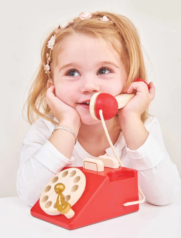 Children will love playing on this sweet telephone. Featuring a vintage rotary design painted in the Le Toy Van iconic red with touches of gold. Written digits and the realistic spinning wheel encourages the development of number recognition. The handset features a bell for sound-effects.