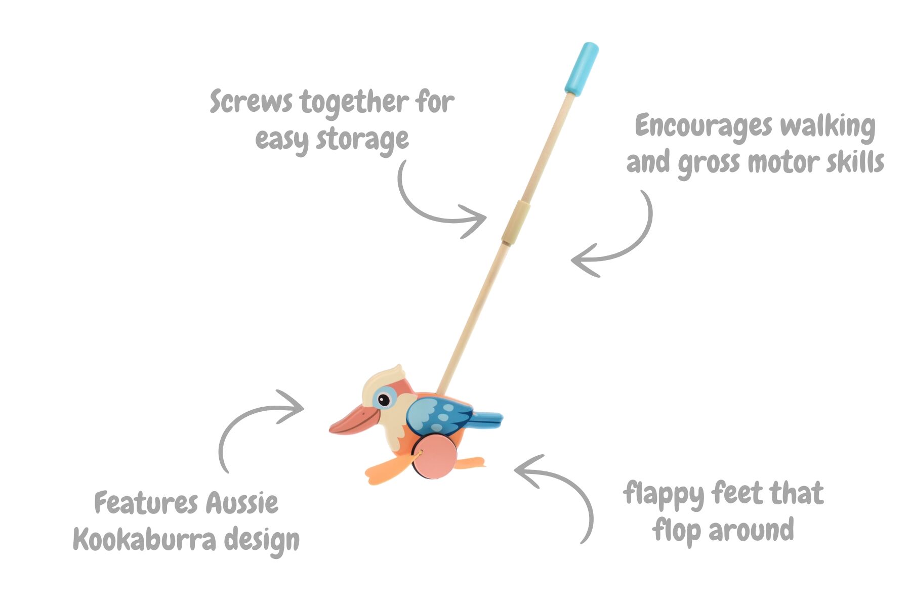 Meet the delightful Push Along Kookaburra from Kaper Kidz charming little bird ready to flutter along in front of your little one! Crafted from smooth, sturdy timber and painted in gentle pastel tones, this sweet kookaburra invites tiny hands to give it a gentle push with the handle and watch it waddle happily across the floor. Perfect for encouraging toddlers to take their first steps, this friendly bird helps build core strength, balance, and spatial awareness through playful movement. Finished with the highest care and coated in child-safe, non-toxic paint, the Push Along Kookaburra is more than just a toy it's a joyful companion on every adventure, bringing smiles and confidence as your child learns to explore their world one step at a time!