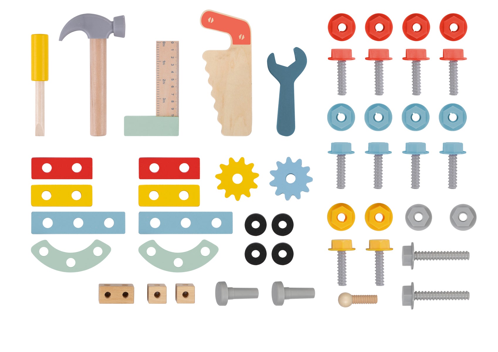 The Tooky Toy Tool Bench Truck Push Walker is a multifunctional toy with tools, moving cogs, and a mini maze, designed to enhance walking and problem-solving skills in a fun, interactive way.Introduce endless fun and exploration with the Tooky Toy Tool Bench Truck Push Walker. Designed in the shape of a truck, this versatile push walker doubles as a tool bench, offering a host of activities to captivate young minds. Packed with heaps of interactive features, the walker includes 5 essential tools, hammer, spanner, set square, screwdriver, and saw, children can use these tools to attach 44 assorted cogs, screws, and timber lengths to the truck, fostering creativity and problem solving skills.