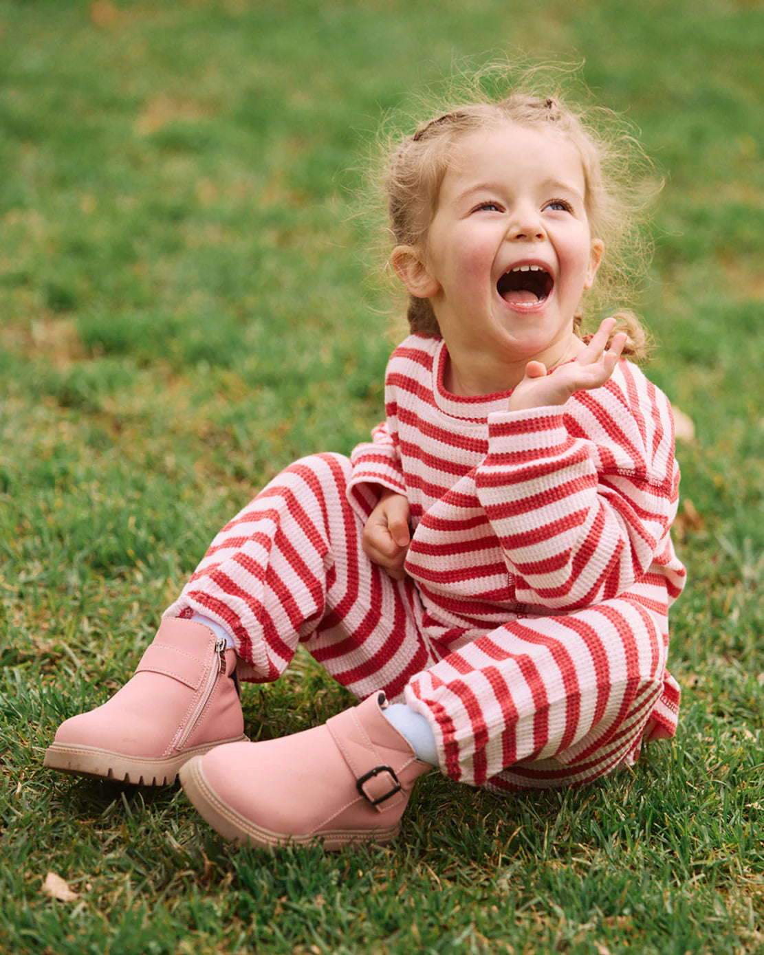 Let your little one step out in style with the Maeve Boot! These adorable pink boots are perfect for all their adventures, whether they're playing at the park or heading to a fun day out. The cute buckle detail adds a fun twist, and the sturdy sole makes them great for running, jumping, and exploring! Easy to slip on and off with the side zip, these boots are comfy and stylish, perfect for pairing with any outfit.