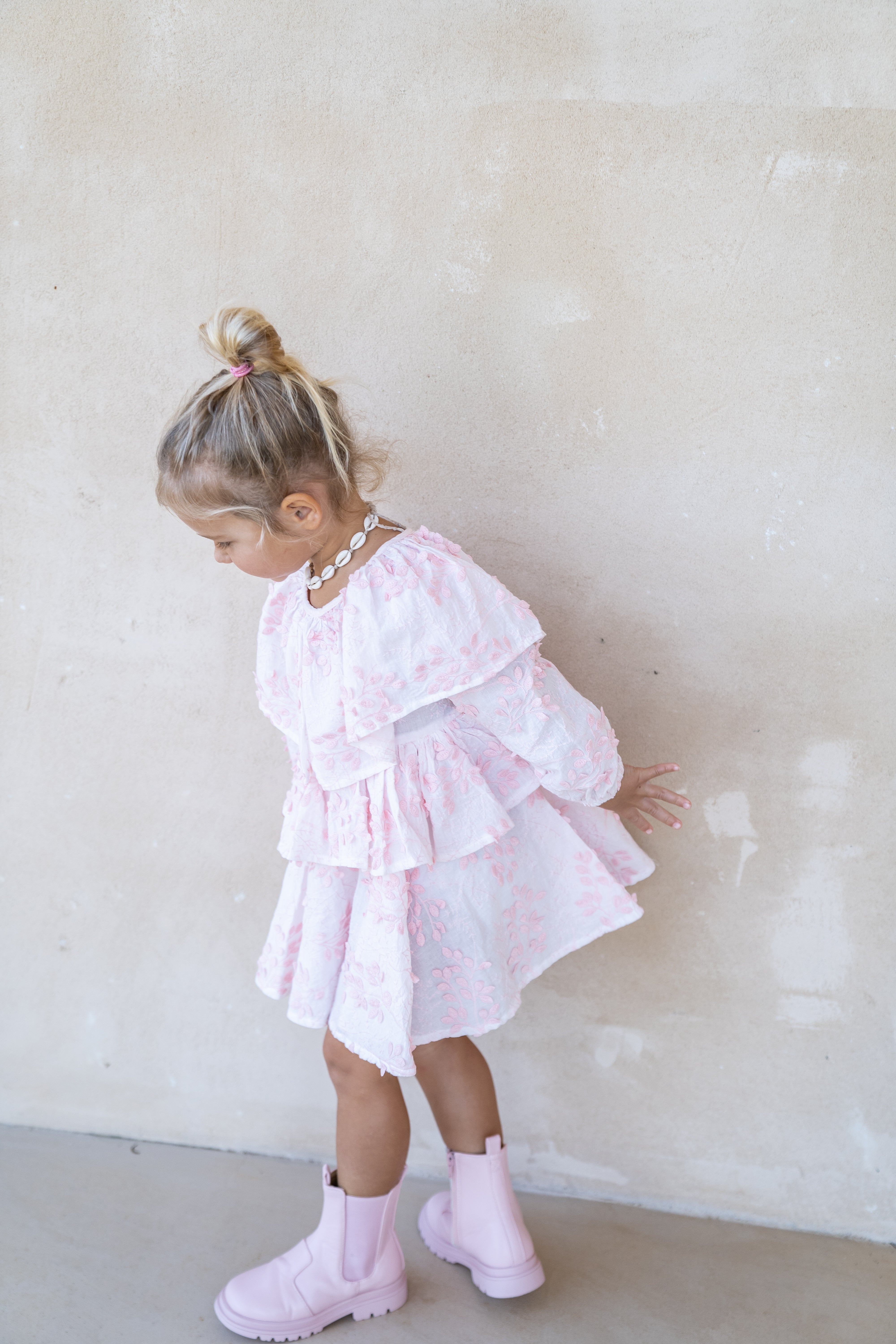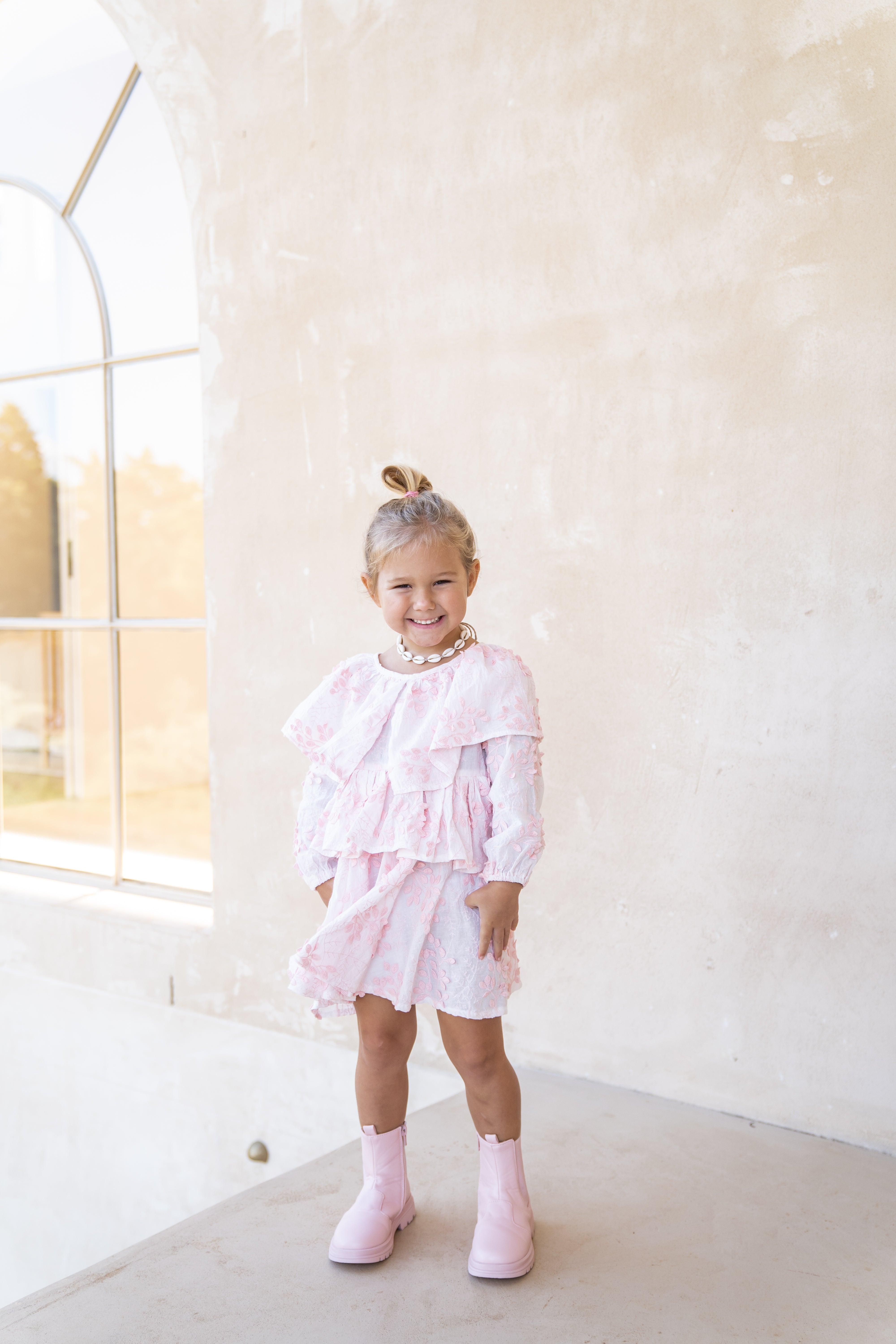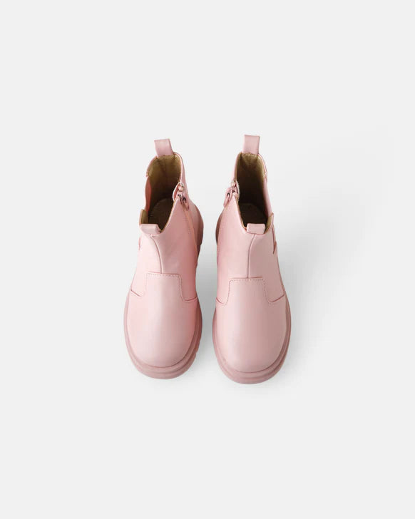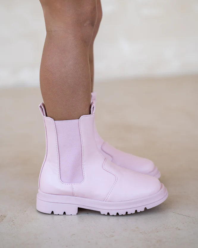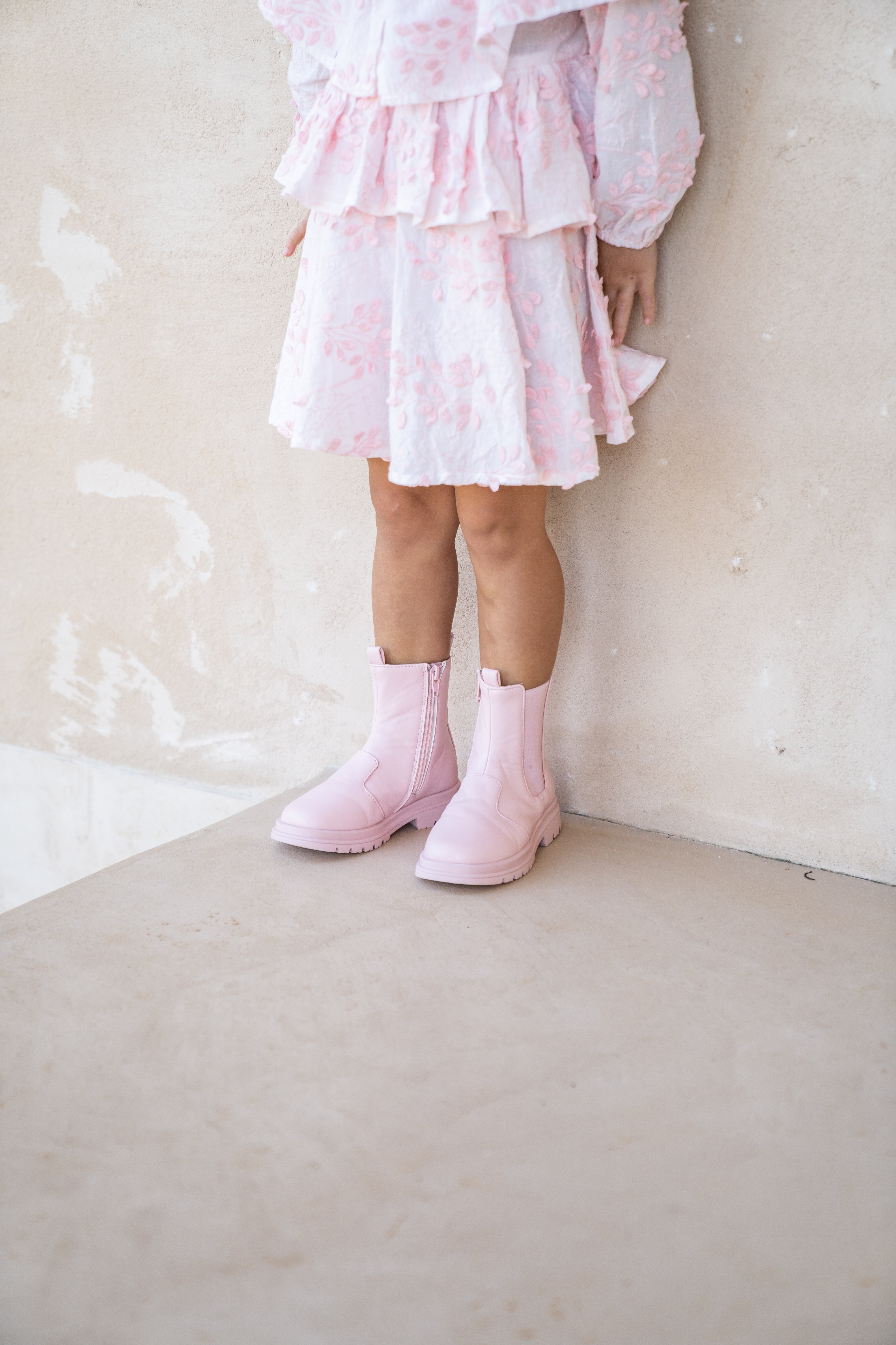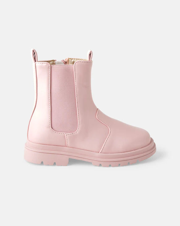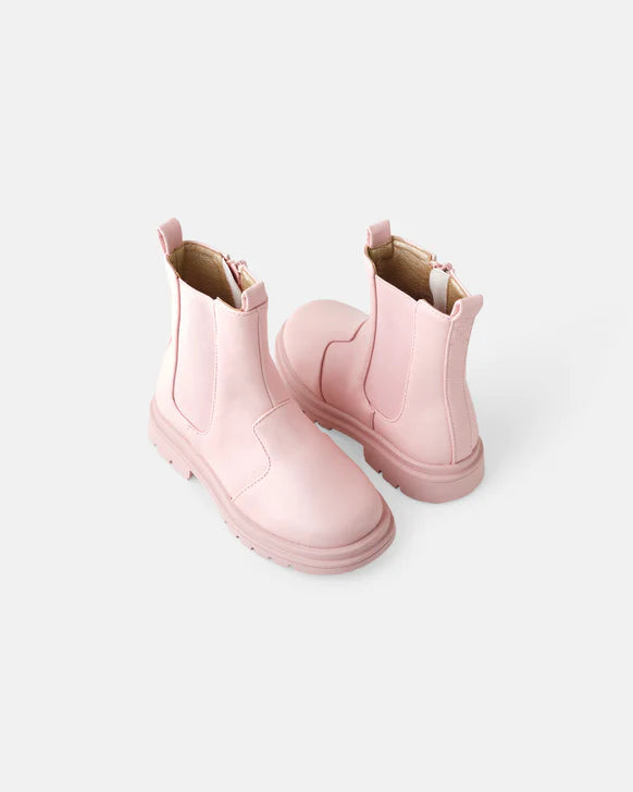 The Rosie Boot in Pink has a chunky outsole with a plush, fleece lining! With an inside zip closure for easy wear, this fashionable boot is one your little ones will love!