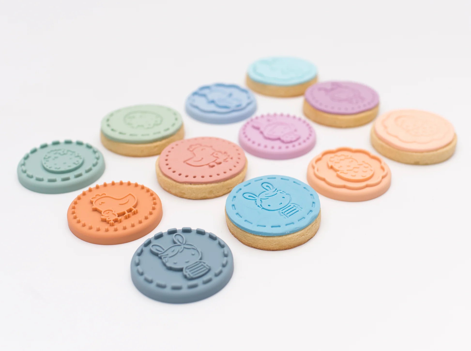 Every Easter Stampies set includes a stainless steel cookie cutter, 1 wooden stamper and 6 conveniently interchangeable, food-grade silicone Easter motive stamps.