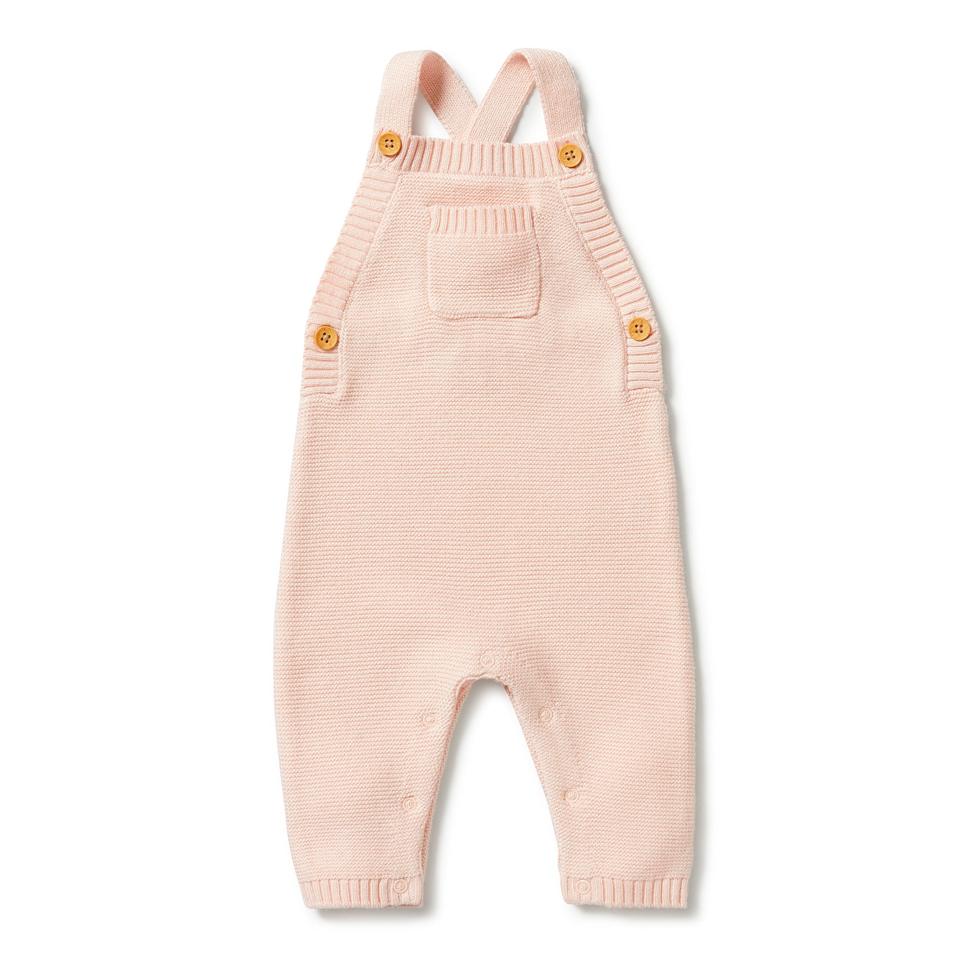 This luxurious knit overall with buttoned shoulder straps is an easy all-in-one style. Featuring a snap leg opening for quick changes, pair it back with an organic rib bodysuit and a matching knit beanie for a super cute winter look.