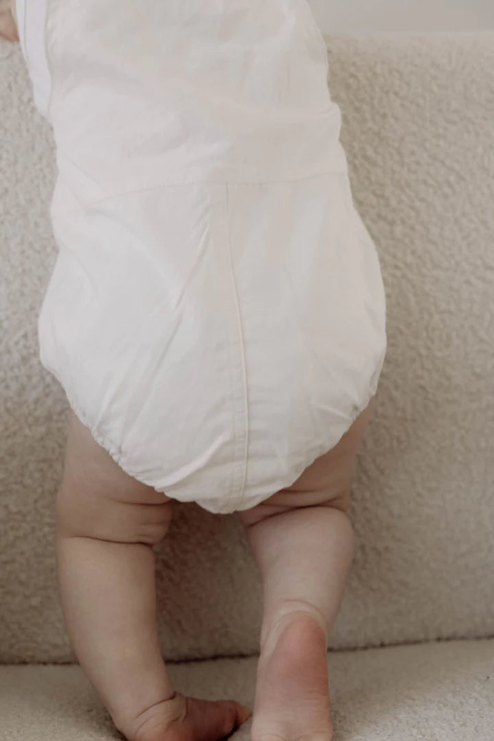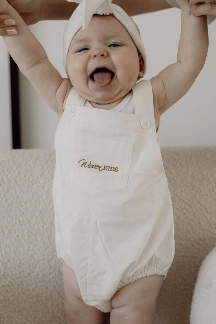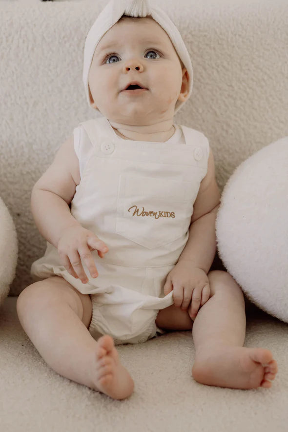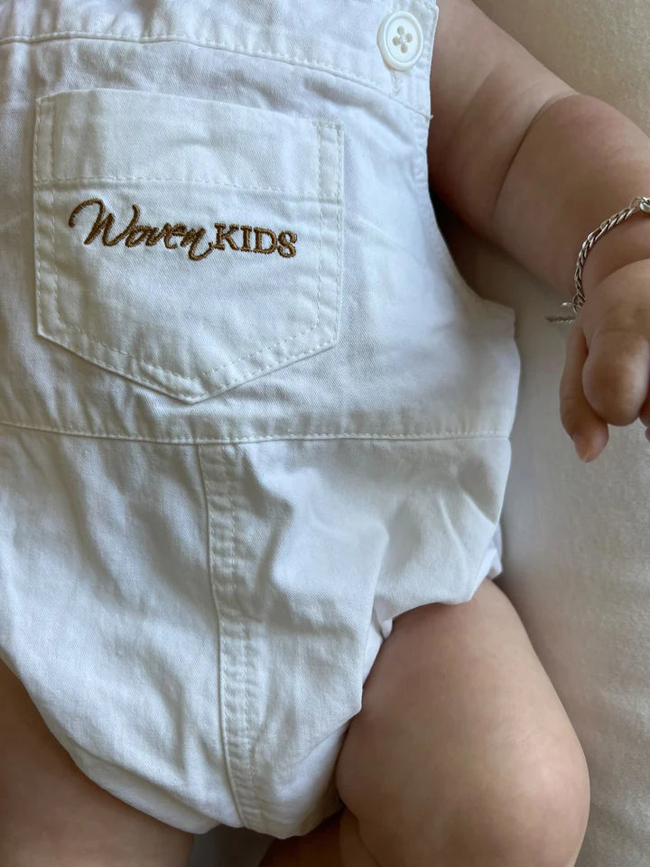 The sweetest neutral pair of white overalls with Woven Kids logo embroidery on the front pocket. These overalls feature 3 buttons on the straps to enable you to change lengths. Soft elastic has been used on the legs to avoid any digging in.