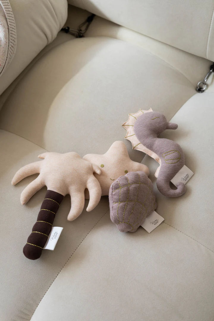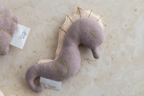Available in 4 designs (seashell, palm tree, star fish + seahorse) these beautiful rattles are exclusively designed by us, featuring metallic gold stitching and are made with little hands in mind.