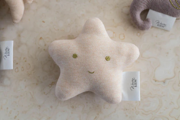 Available in 4 designs (seashell, palm tree, star fish + seahorse) these beautiful rattles are exclusively designed by us, featuring metallic gold stitching and are made with little hands in mind.