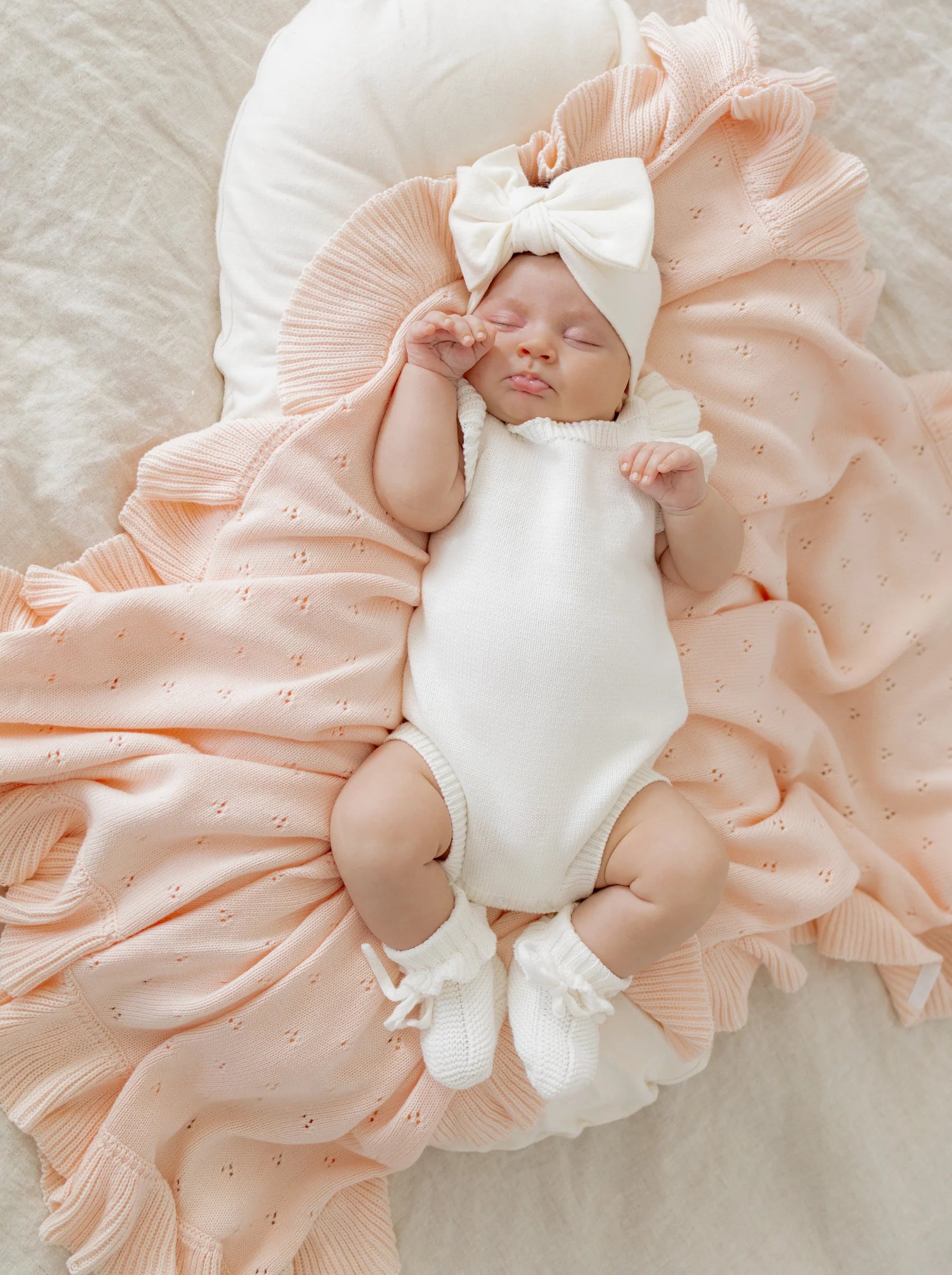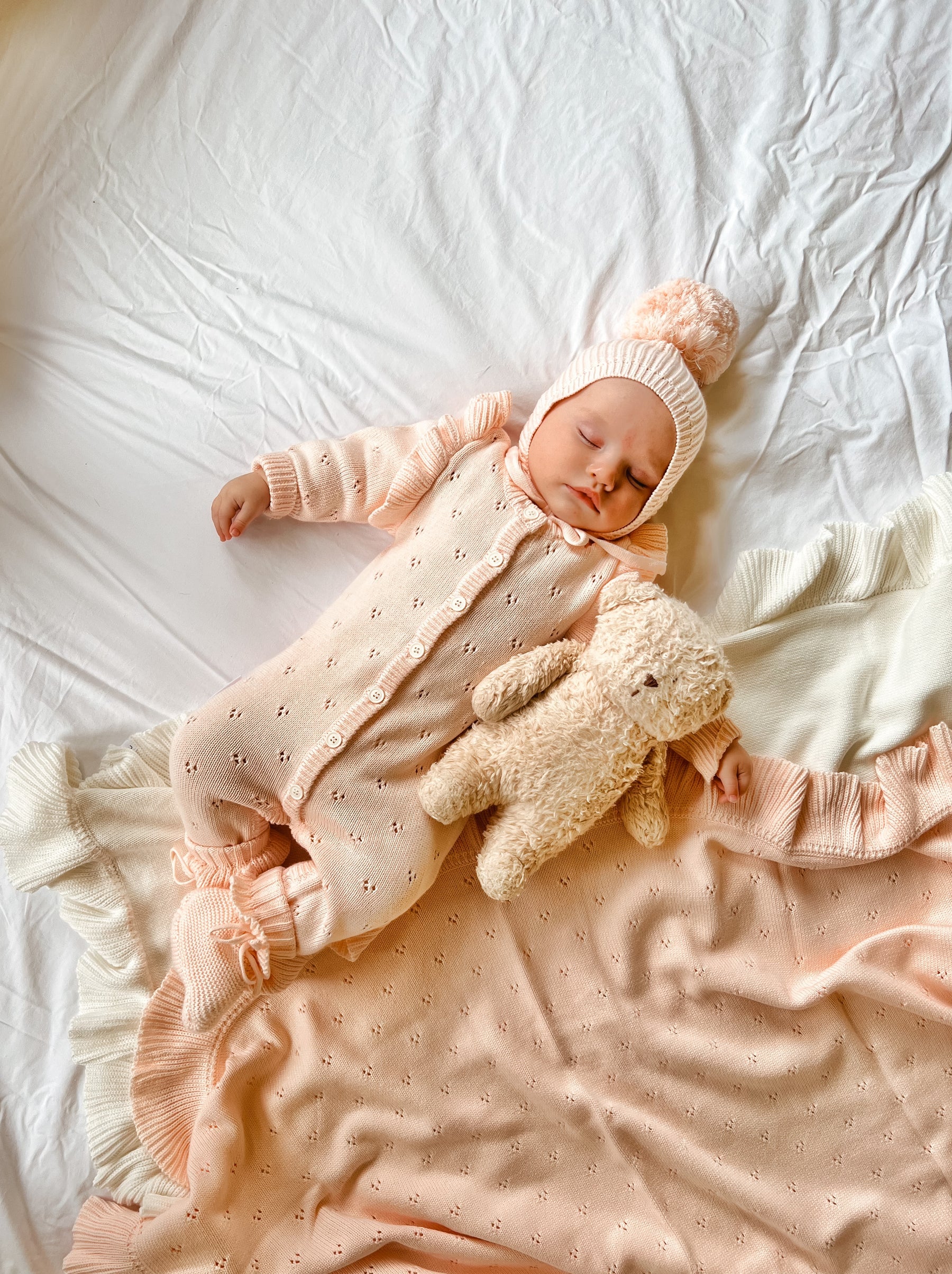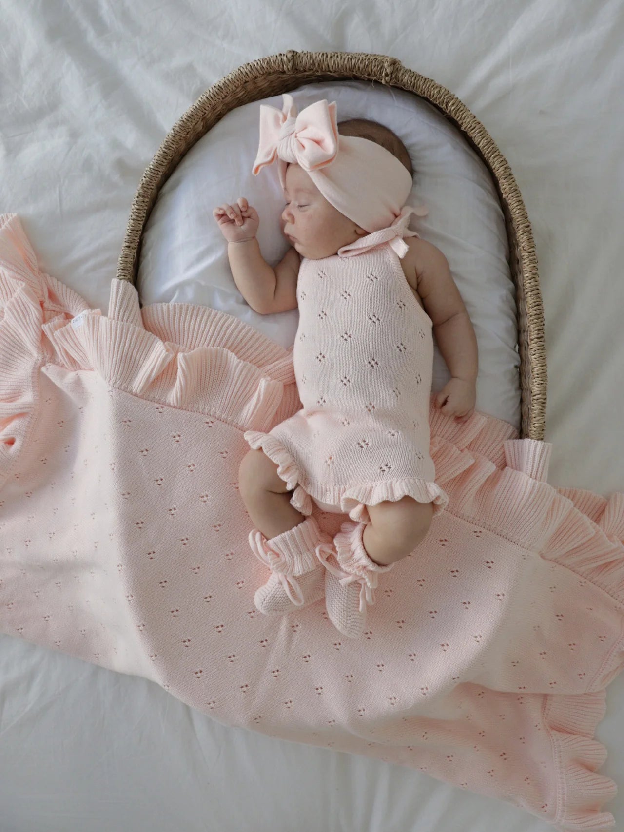 A thin knit blanket featuring gorgeous pointelle detail and a frill hem. A lightweight knitted blanket, match with our Primrose Signature Collection.