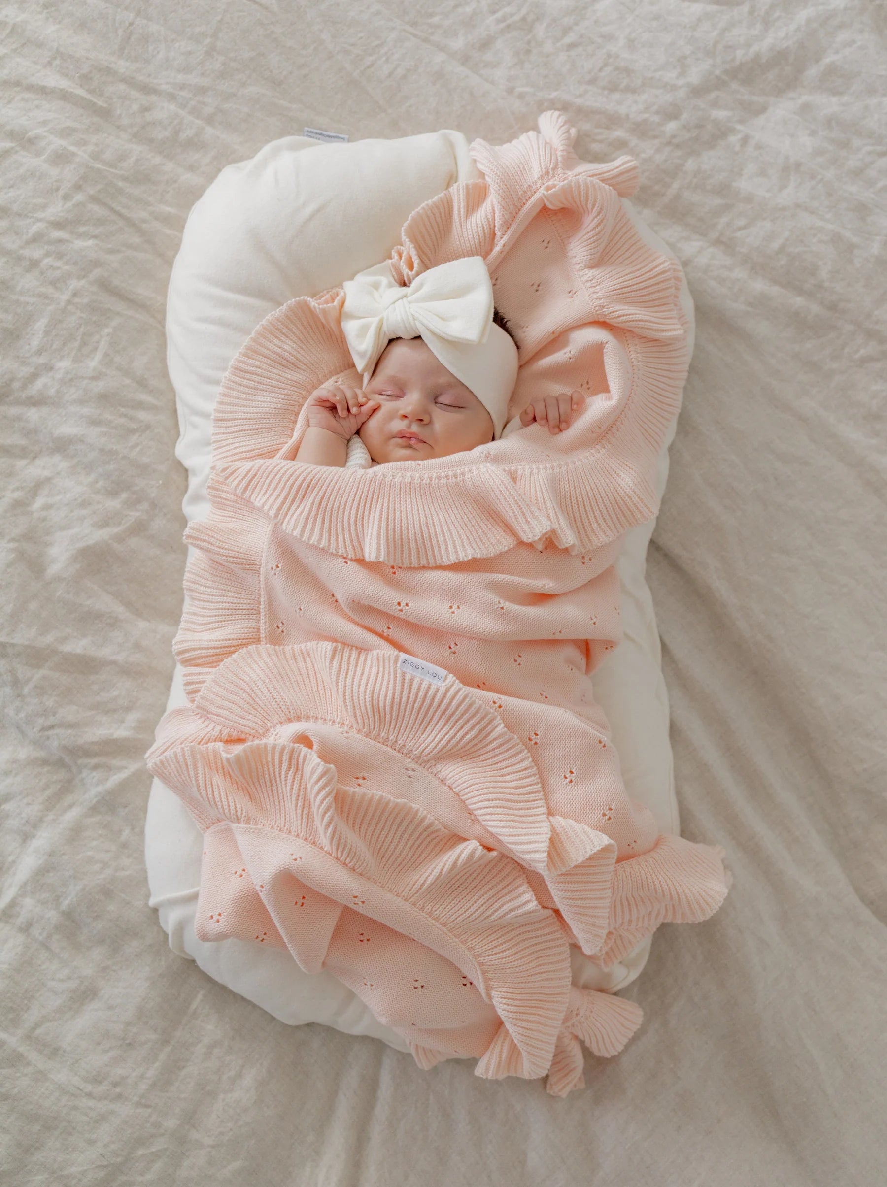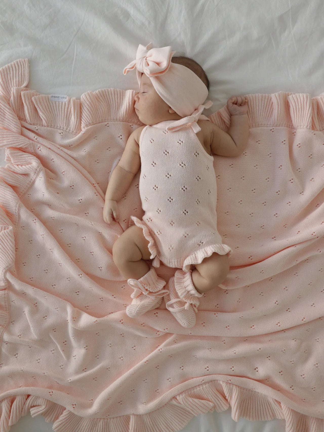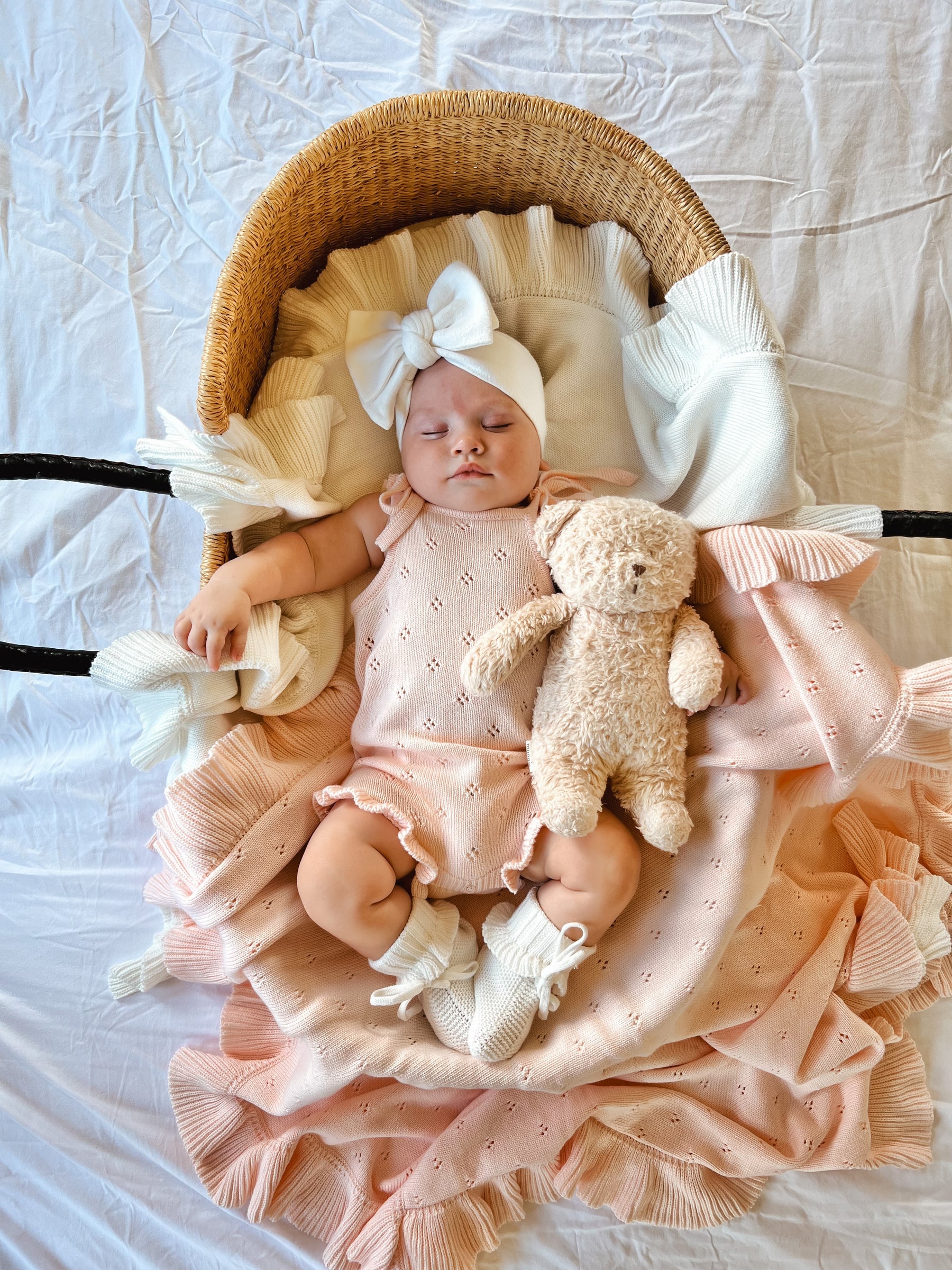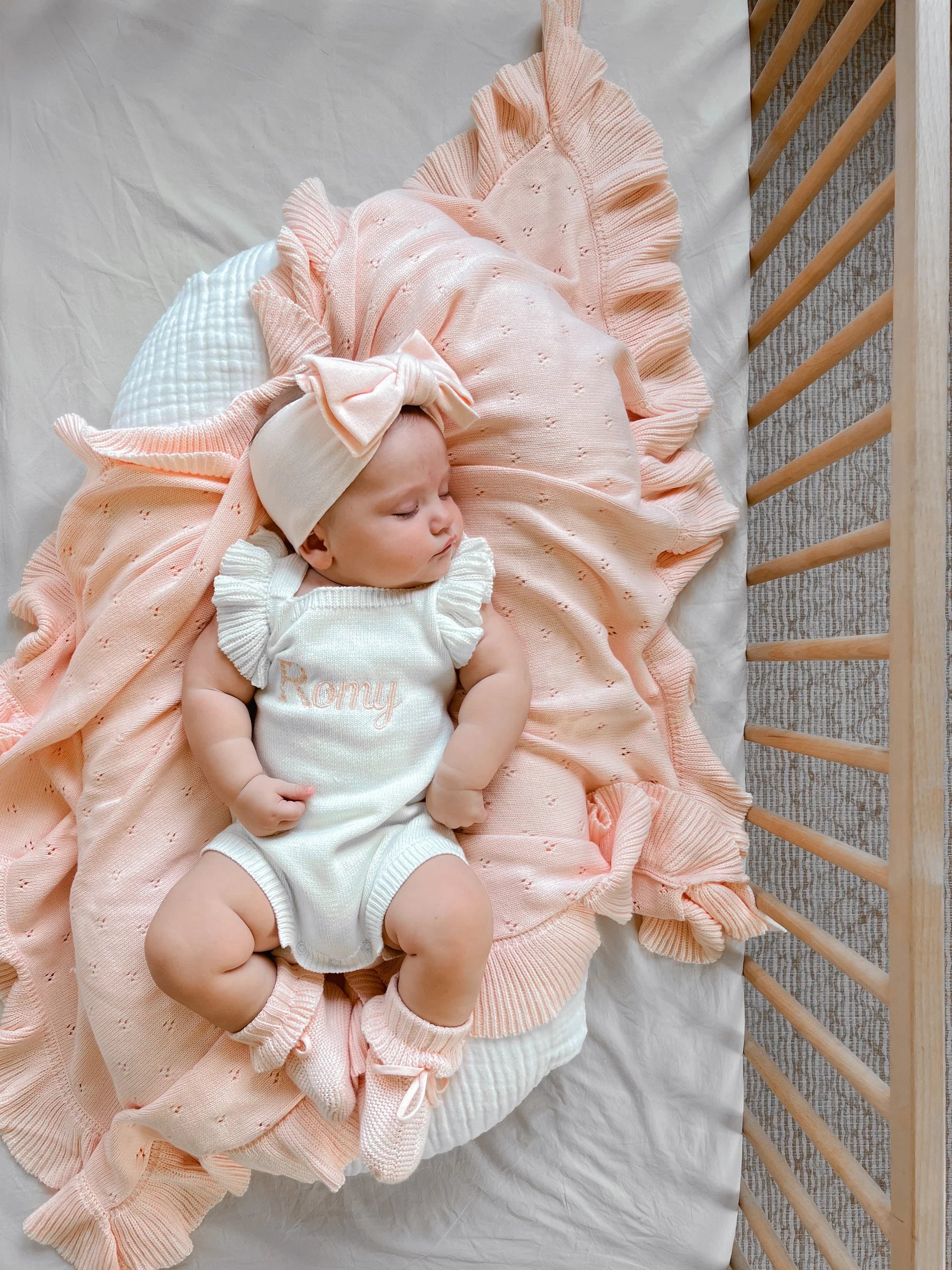 A thin knit blanket featuring gorgeous pointelle detail and a frill hem. A lightweight knitted blanket, match with our Primrose Signature Collection.