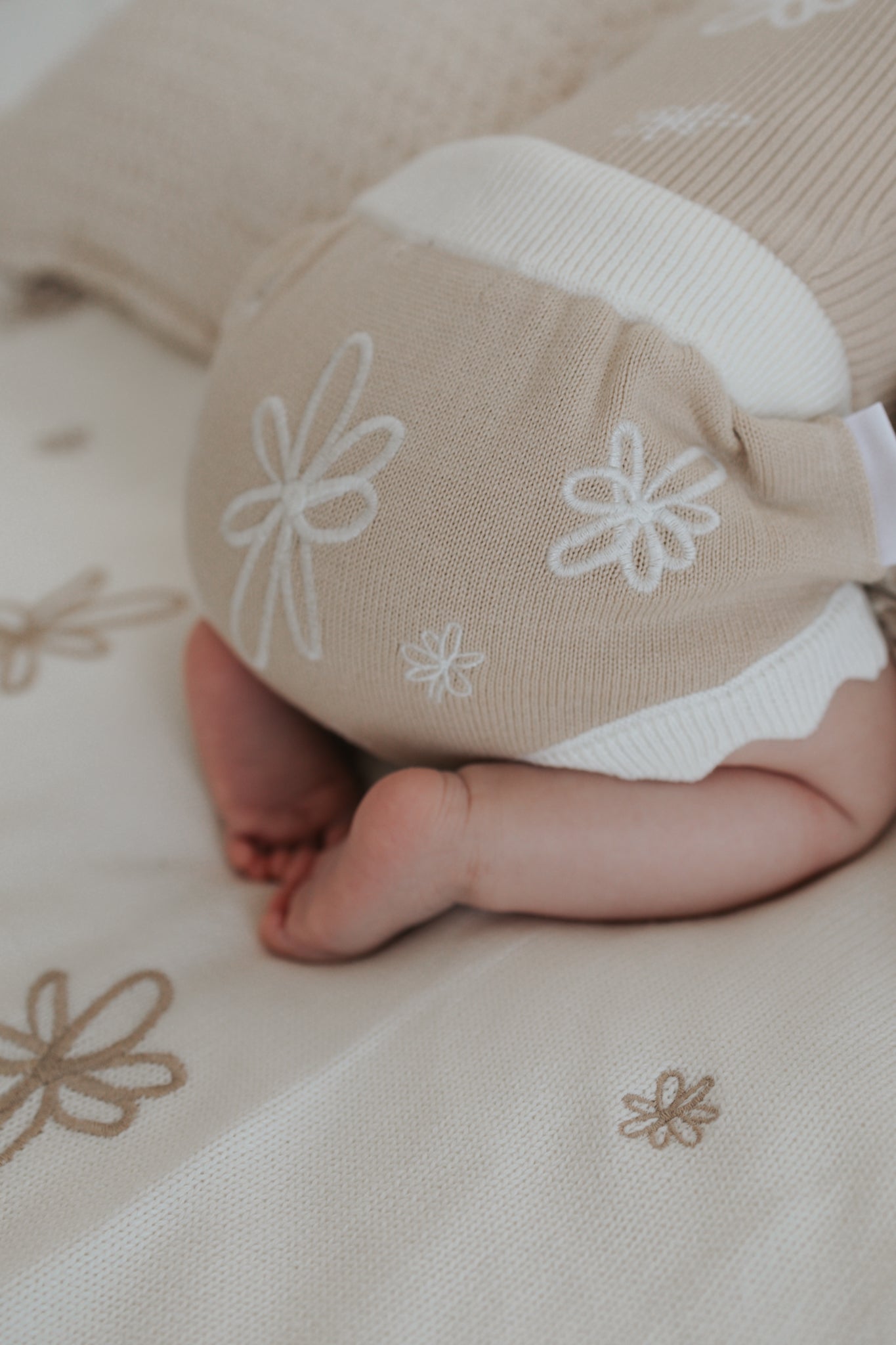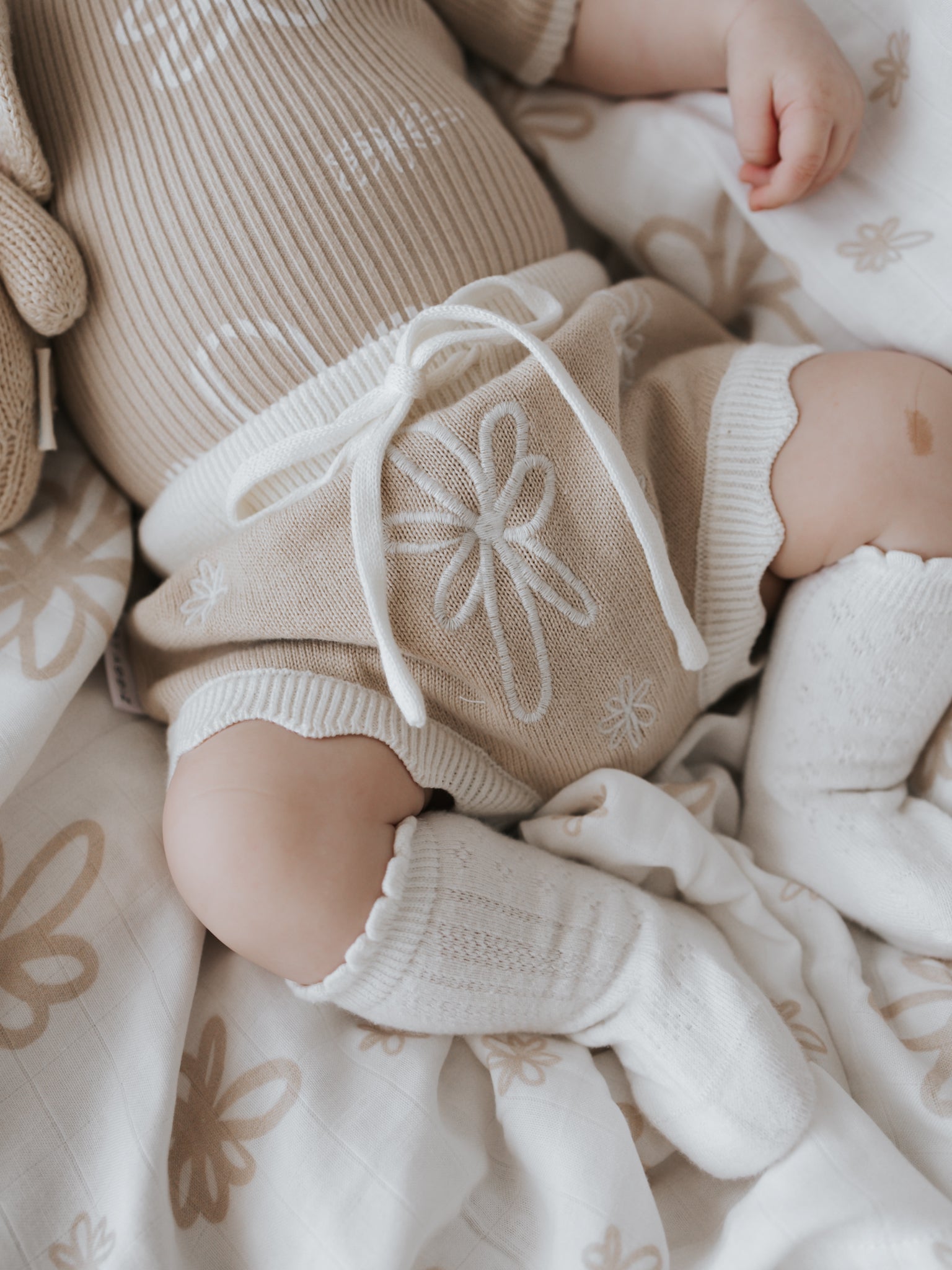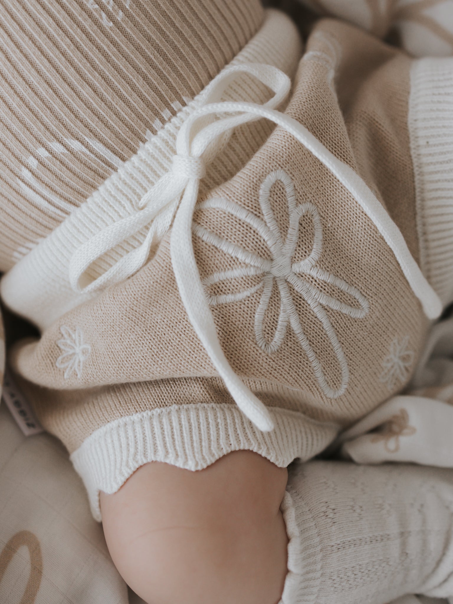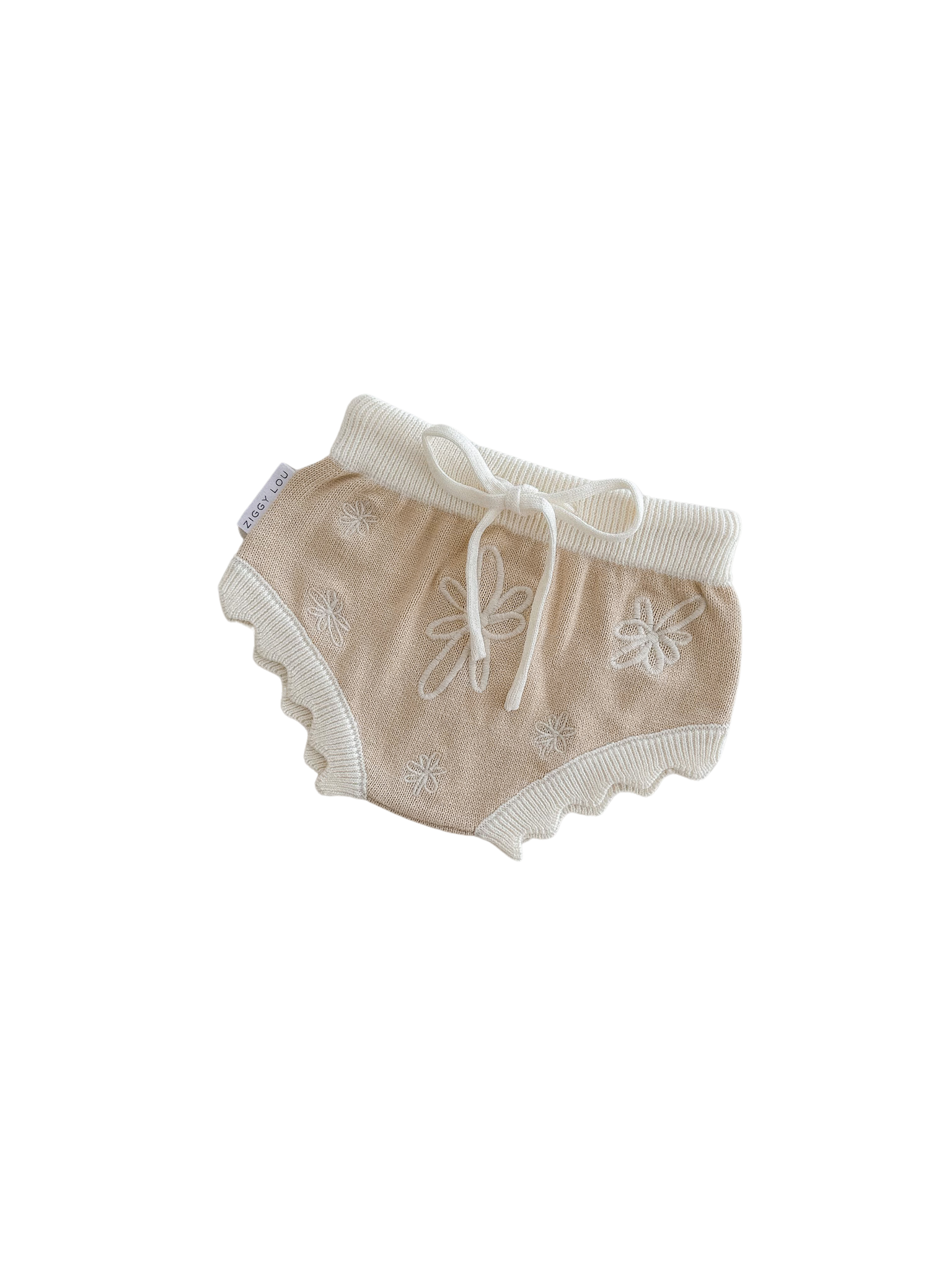 Knitted bloomers in our Latte colour featuring our embroidered Gia design with a scalloped detail around the leg, elastic waist and functional drawstring
