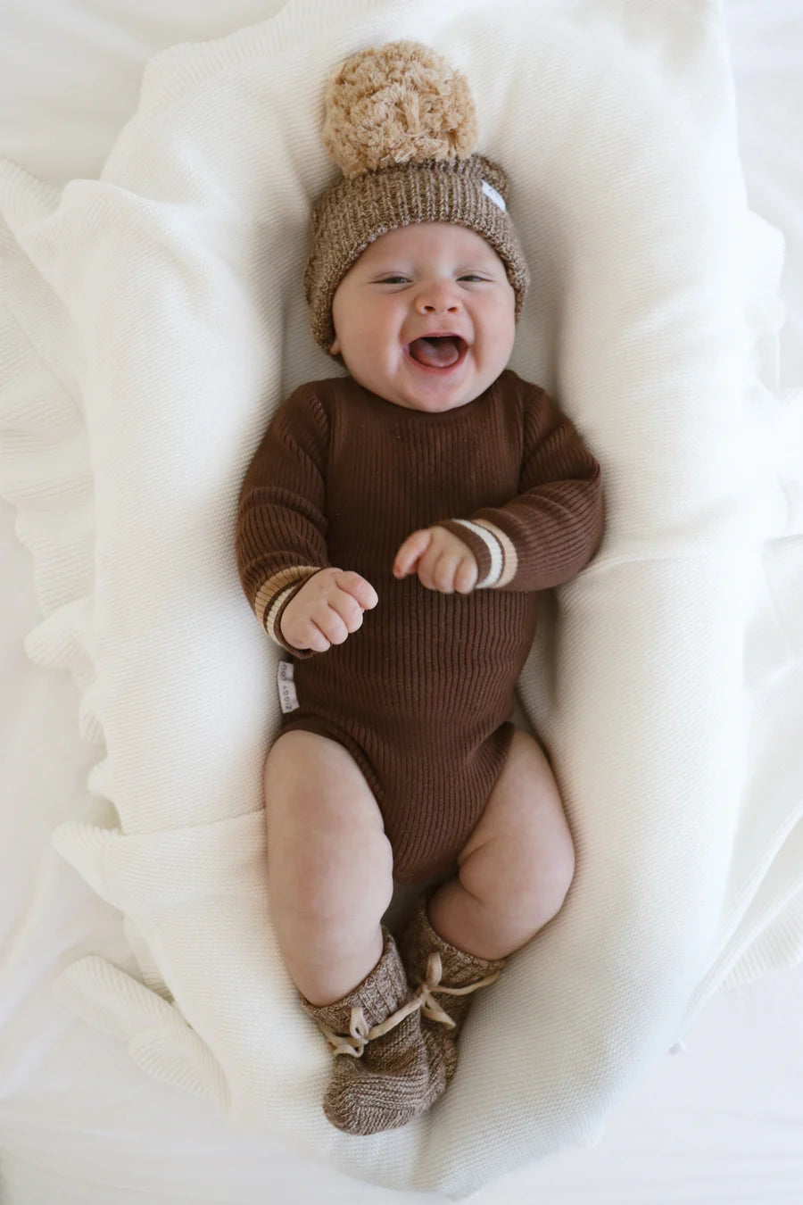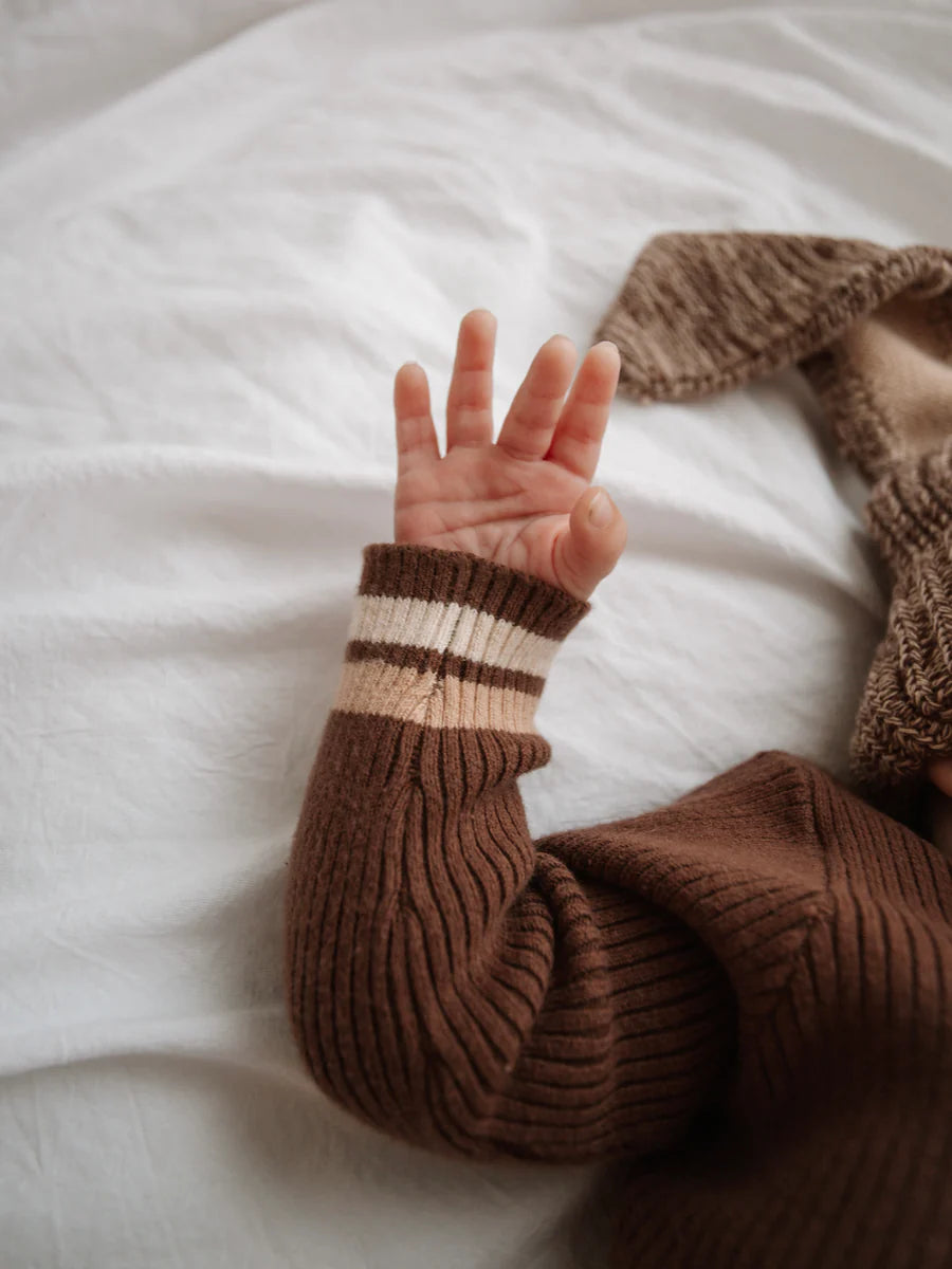 Ribbed, long sleeve, bodysuit with two stripes at the bottom of each sleeve. Functional press snaps at crotch for easy nappy changes and press snaps on shoulder for easy on/off. Match with items from our Cedar Easter Collection.