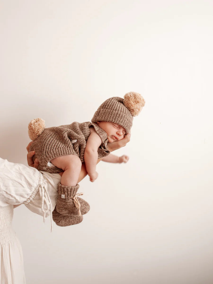Knitted booties to compliment our Cedar + Theo Easter Collection. Functional drawstring to ensure booties don't fall off when worn. Matching Easter Bonnet + Beanie also available.