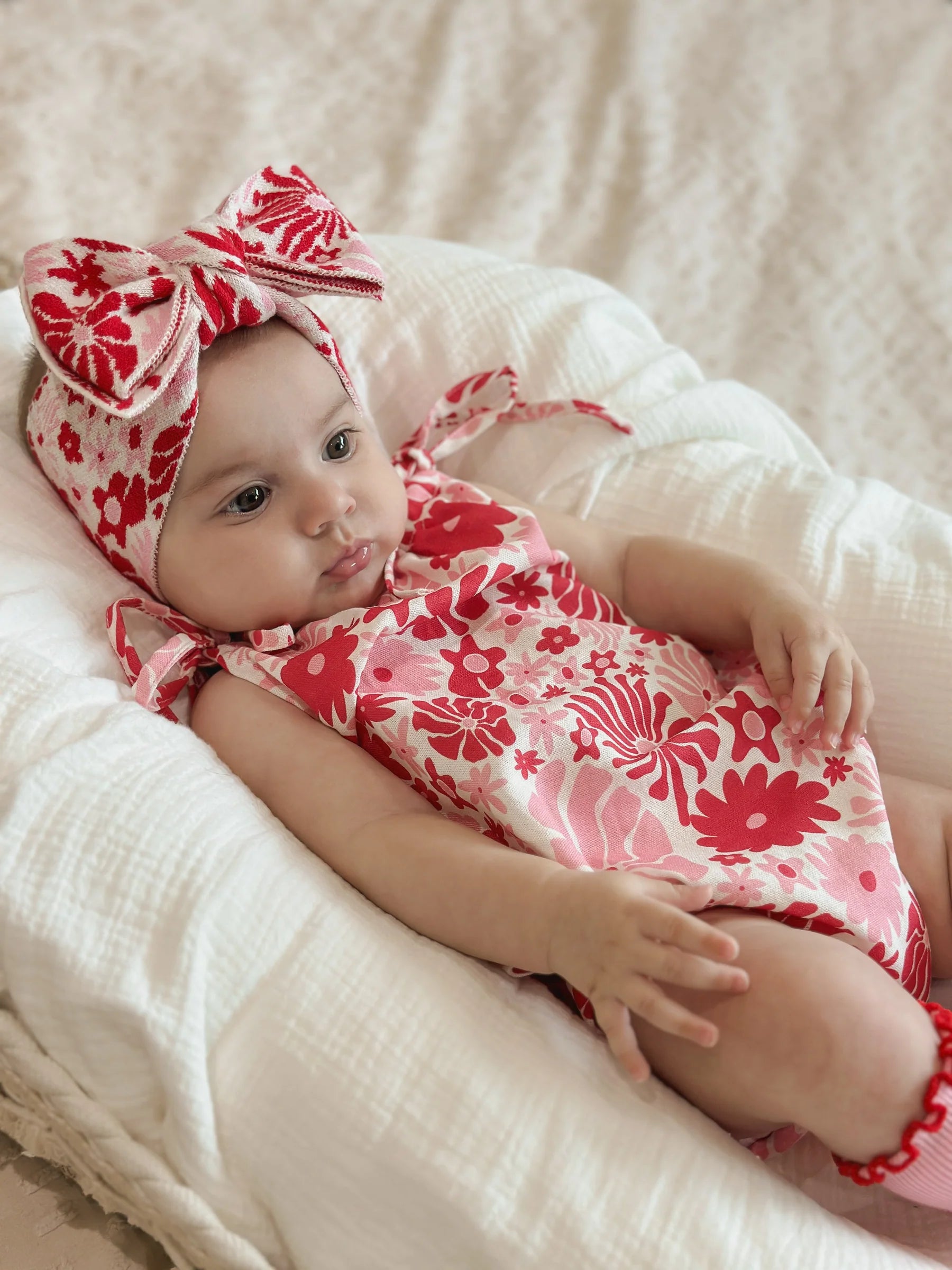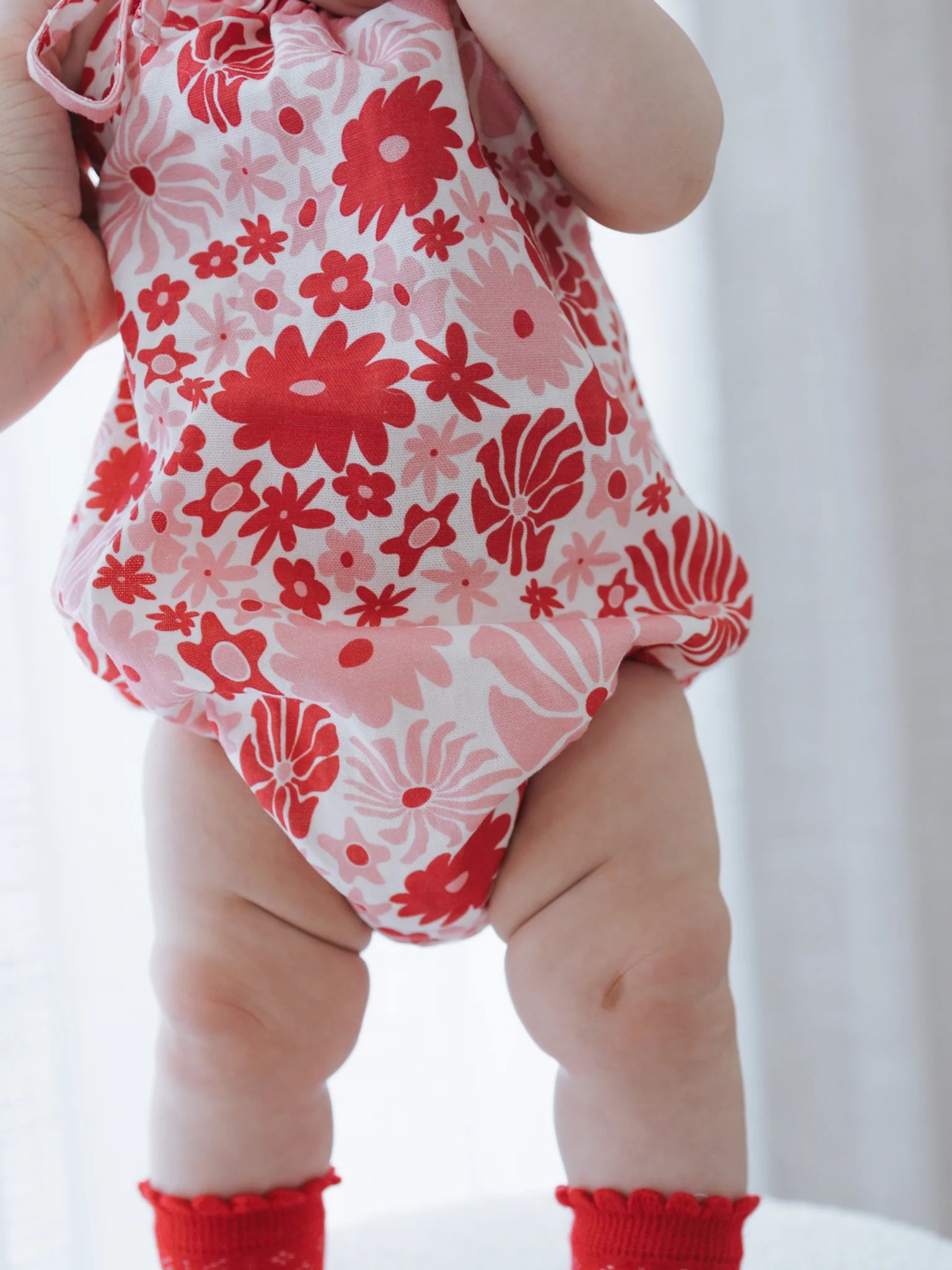 A lightweight linen blend romper featuring our Rosa printed design. Functional ties at shoulder and snap buttons at the crotch for easy on/off and nappy changes