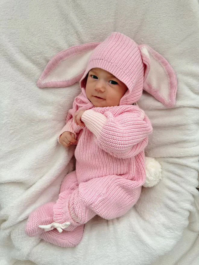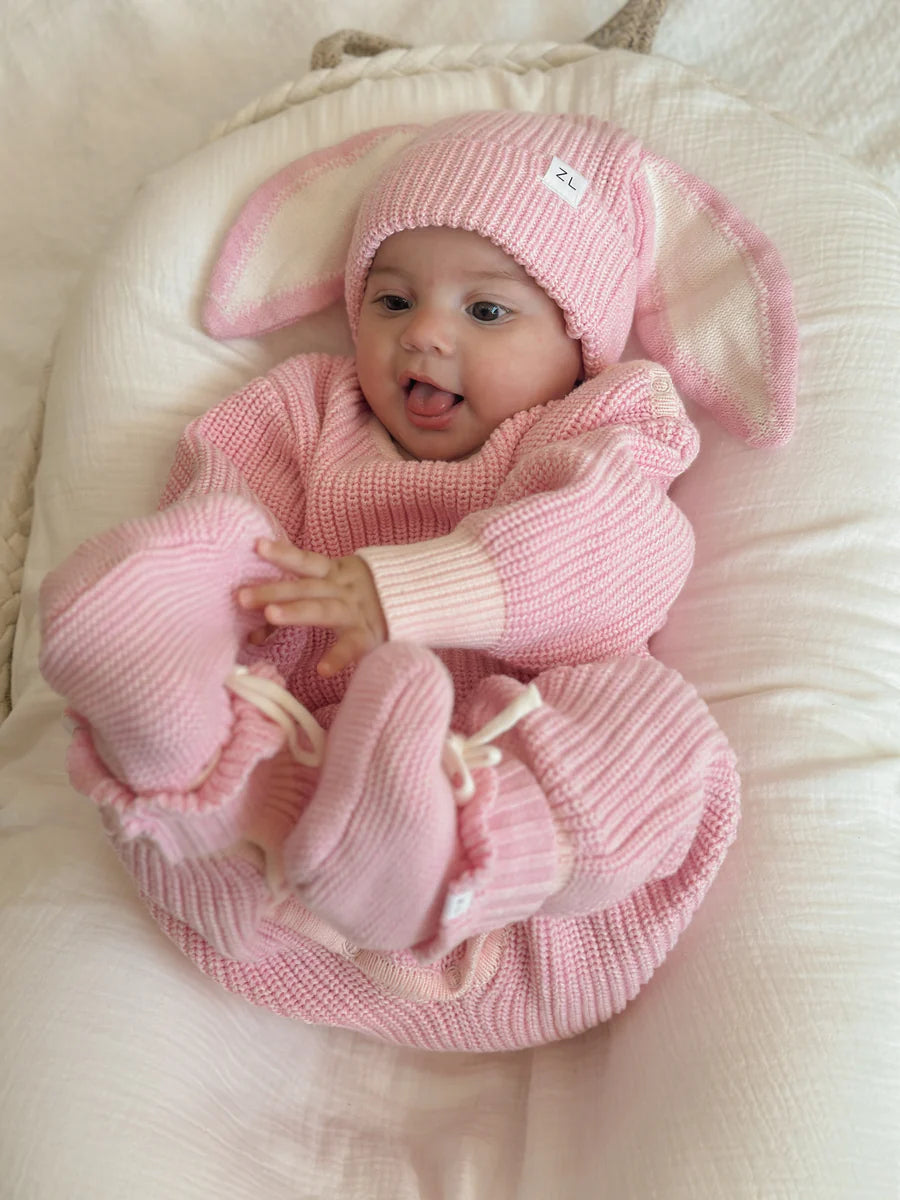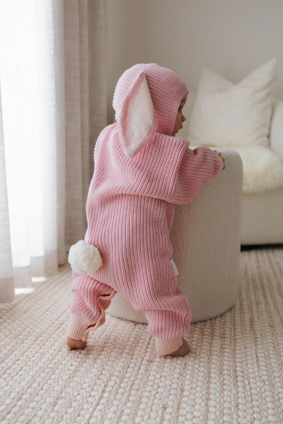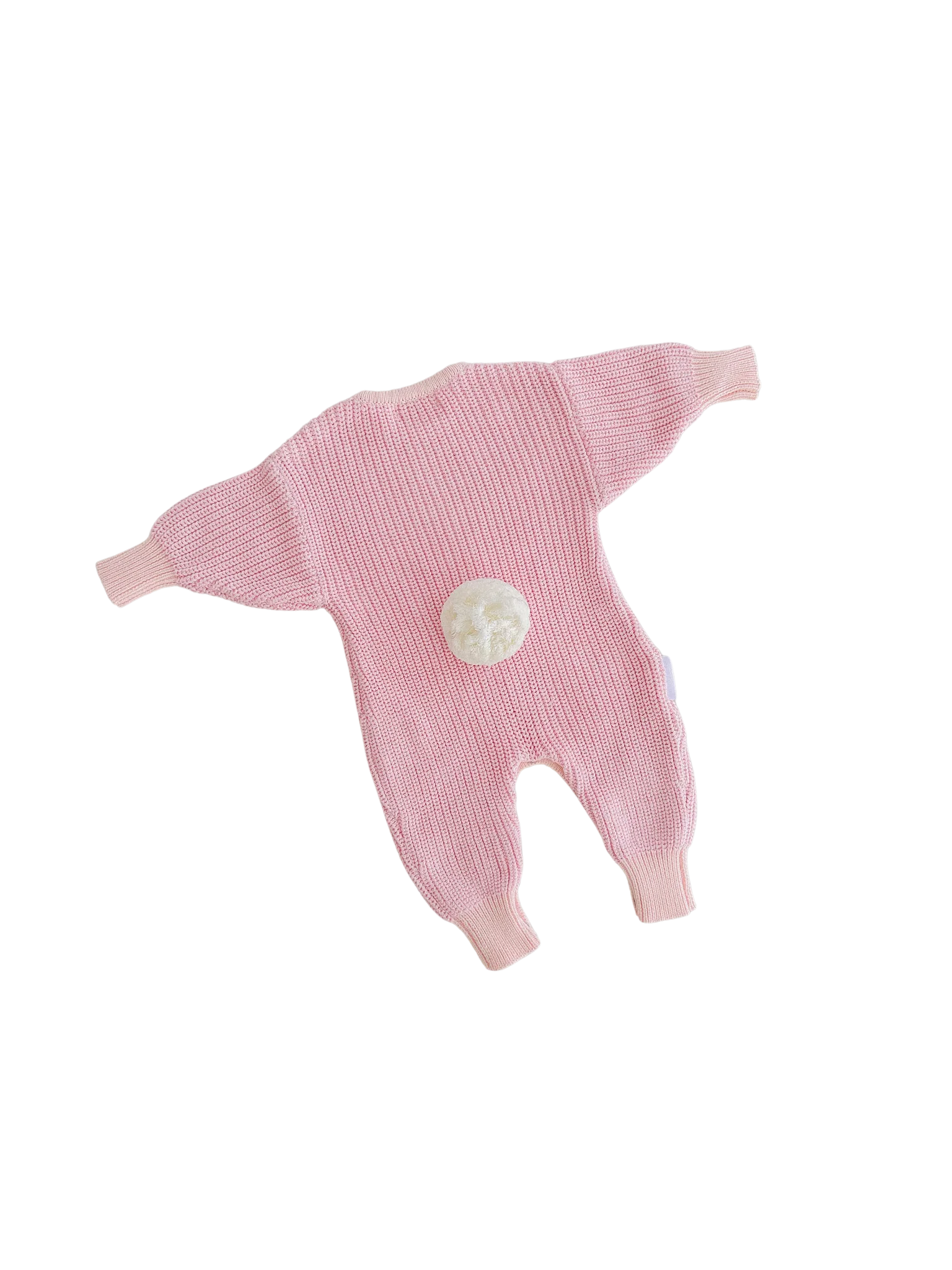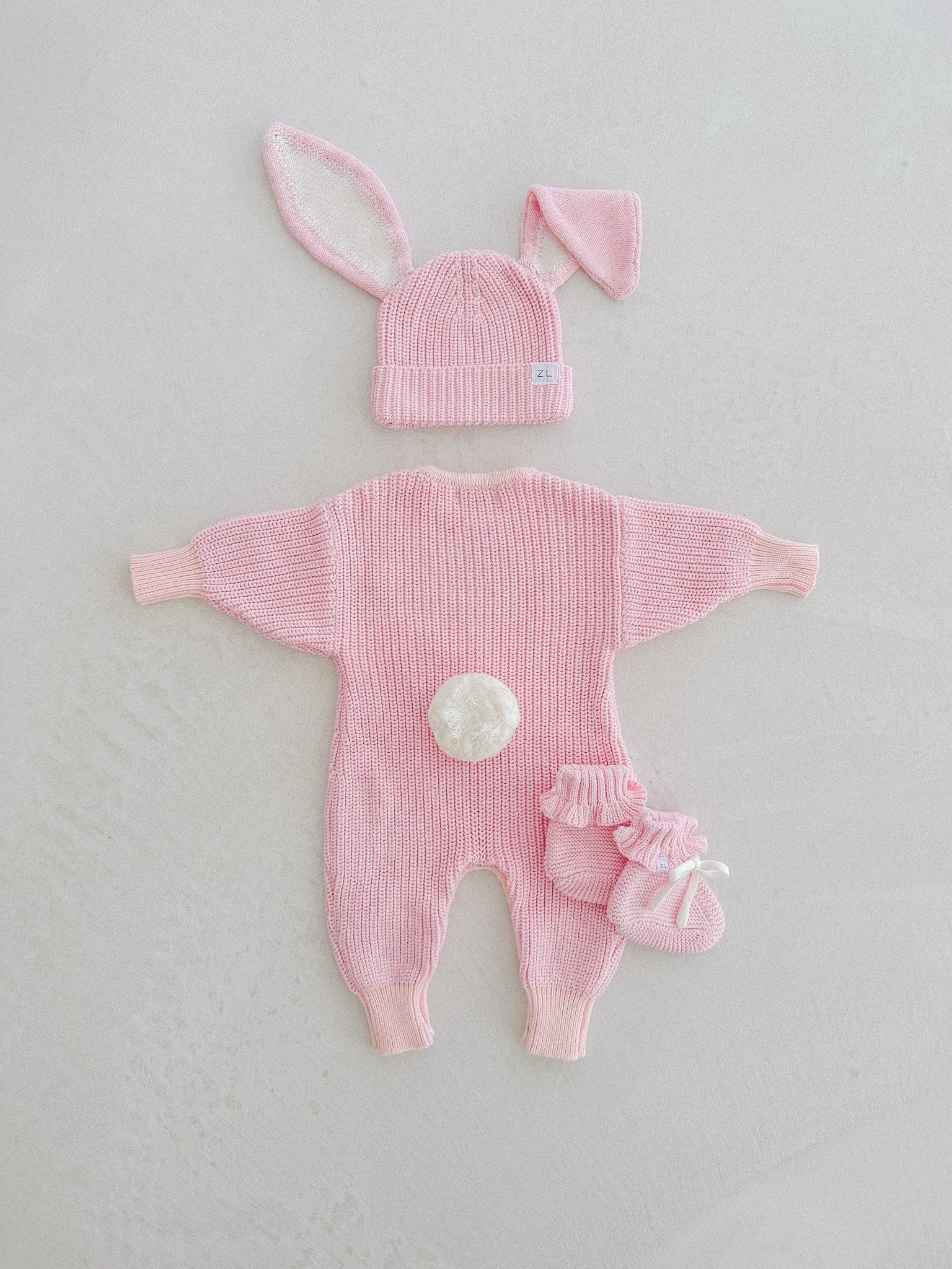 Our Easter winter playsuit in our two tone Dahlia colour features an adorable and removable bunny tail (press snap) Functional snaps at crotch for easy nappy changes, and snaps at shoulder for easy on/off. Matching Dahlia Easter Beanie and Booties also available.
