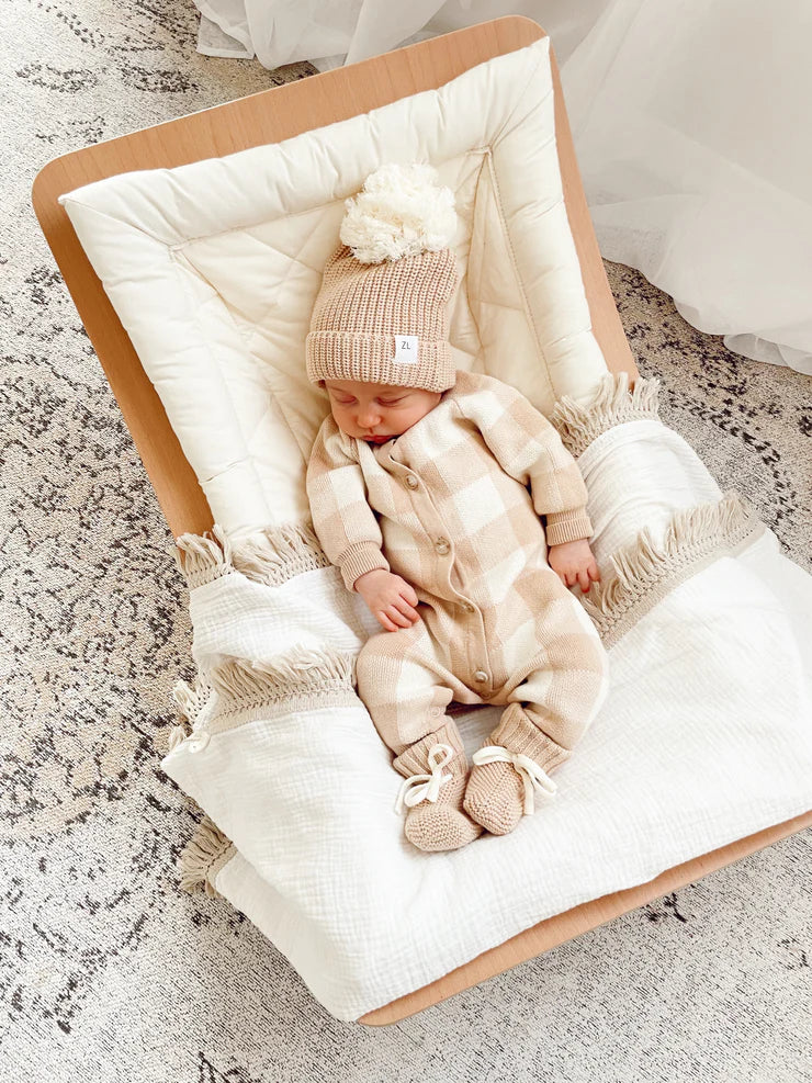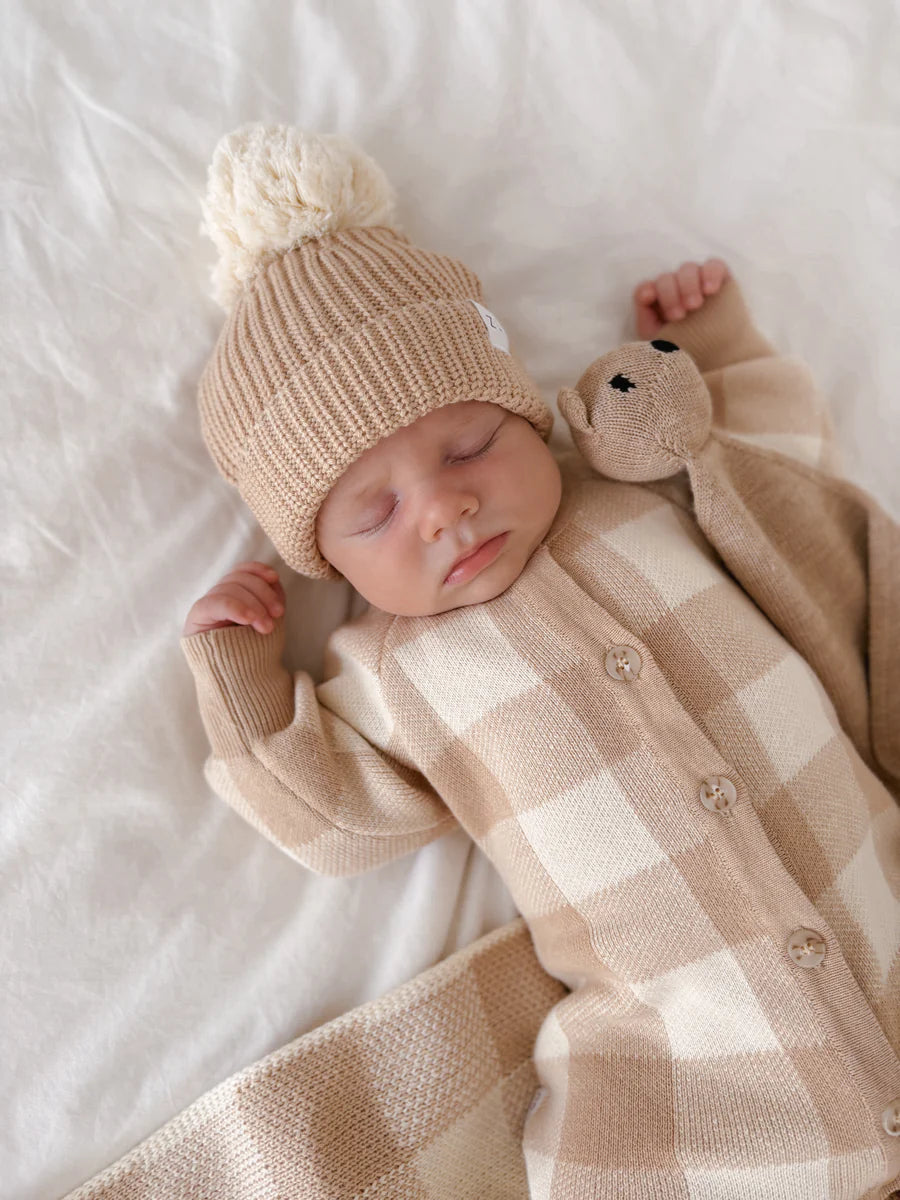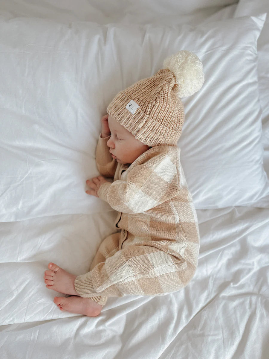 A beautiful knitted romper, designed with comfort in mind. Designed to be a timeless keepsake to remember just how teeny, tiny they were. A high quality piece to pass down to other siblings or a special something to pop in their keepsake box. Pair with our matching beanies & booties for the perfect winter outfit. Functional snaps at crotch for easy nappy changes.
