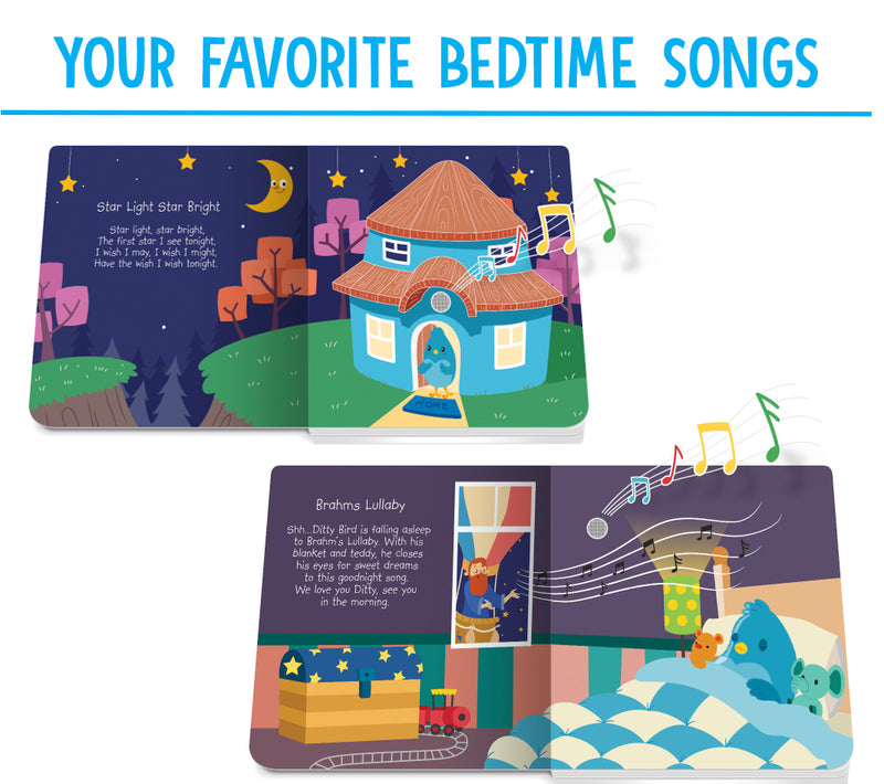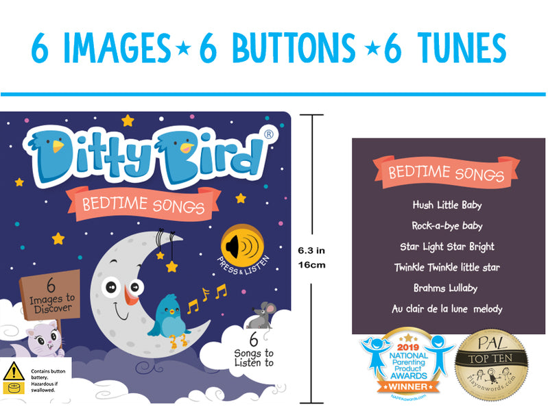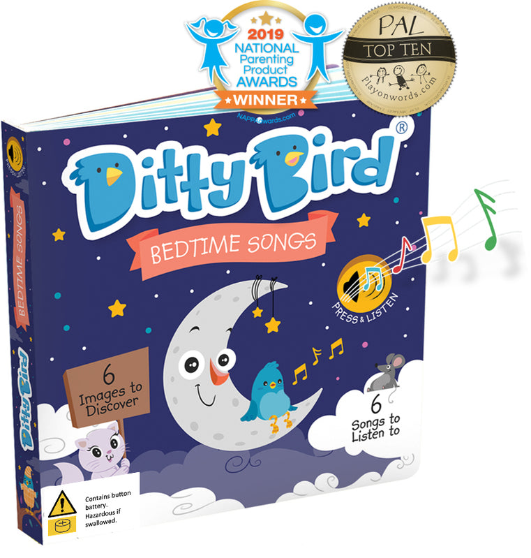 Join Ditty Bird as he sings 6 of his favourite calming bedtime songs. Touch the sound button to hear the song. Touch the button to turn the sound off.