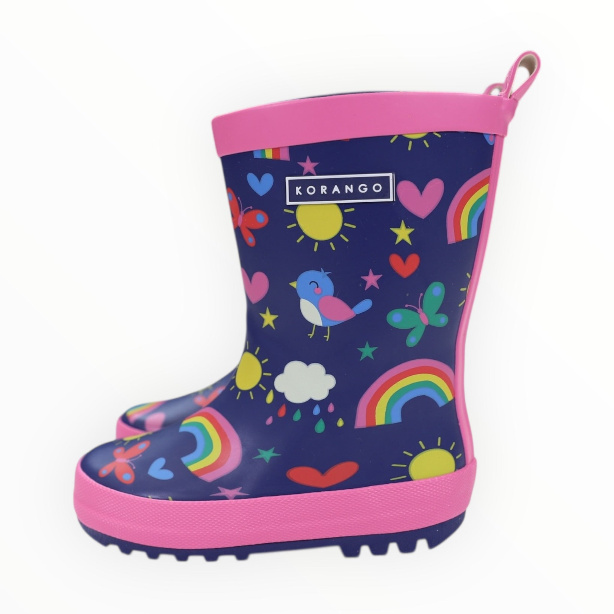 Bring some sunshine to rainy days with our Spring Rainbow Gumboots! Adorned with playful birds, hearts, and flowers on a navy background, these boots combine charm and practicality. Bold pink accents add a splash of fun, while the soft cotton lining keeps little feet warm and dry. With an easy pull-on tab, they’re perfect for kids to slip on and dive into every puddle-jumping adventure!