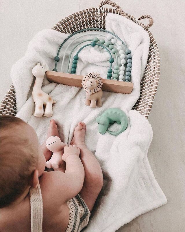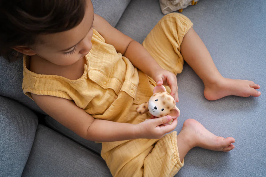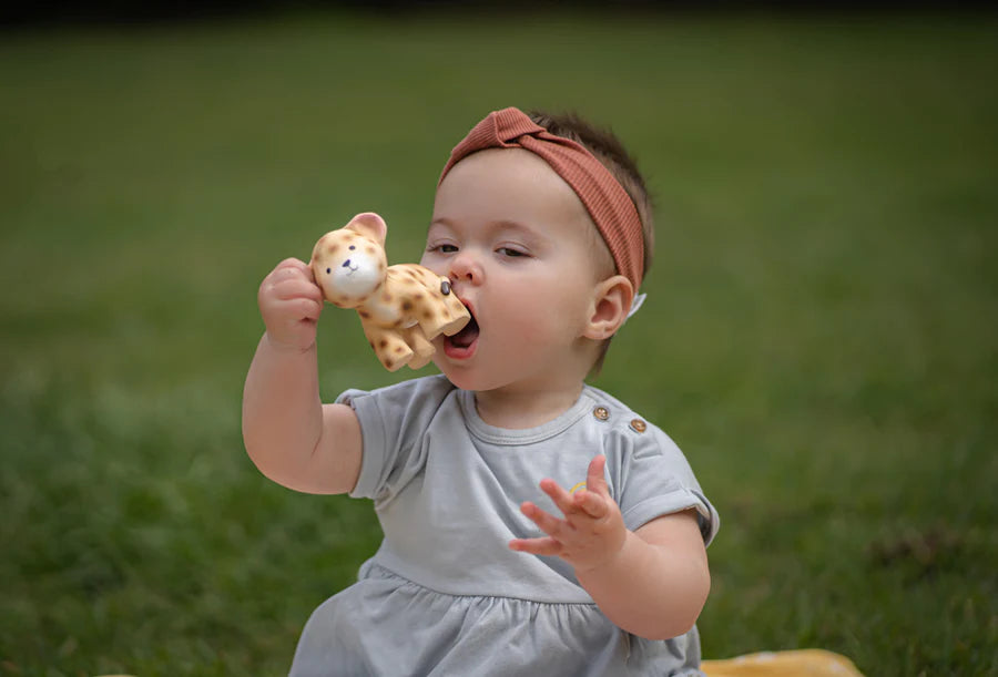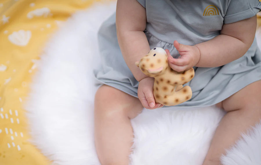 An adorable all rubber teether that is great for little hands to grab and squeeze.